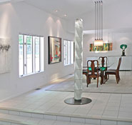 This home sits on over 3 wooded acres. A guest house is just off the right edge of this photo. The original house, built by the collectors, was completed in 1987. The owners, who weren’t even collectors back then, moved from their guest house into what was then a comfortable contemporary home. Their art collection started in 1993, and beginning in 1995, they started collecting contemporary glass art. However, by 2002 they felt the collection was “taking over” the house. As a result, approximately 1,800 square feet was seamlessly added to the home in 2005 in the form of gallery space and a study. Now, for friends, neighbors and local art groups, the home has become somewhat of an art destination. The rear view of the house shows steps leading up to the pool and cabaña. Click below to start your tour.Collection 19's Gallery Images