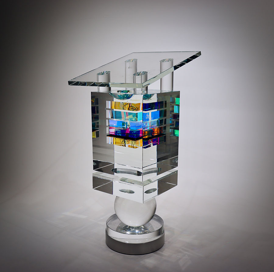 Toland Sand is renowned for his innovative use of dichroic glass and polished crystal. Born in Berkeley in 1949, Sand earned a philosophy degree before beginning his glass career in 1976, taking over a small stained glass business, and gradually transitioning to glassblowing and constructed glass sculpture. Toland is represented by Onessimo Fine Art in Palm Beach Gardens, FL. Click on each photo to the right for a full picture.