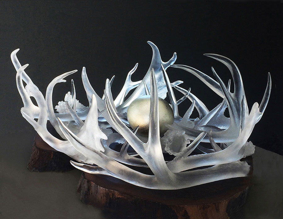 Eagle's Nest, 2019; 33 x 28 x 16 inches; cast crystal glass and white gold leaf egg