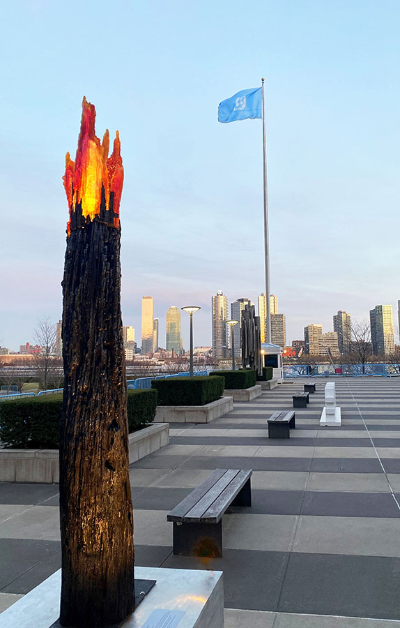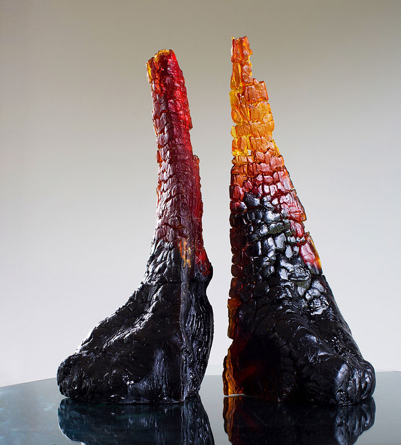 Wildfire, 2022; 96 x 16 x 16 inches; cast glass and bronze, on exhibit at The United Nations in New York City for the International Year of Glass in 2022