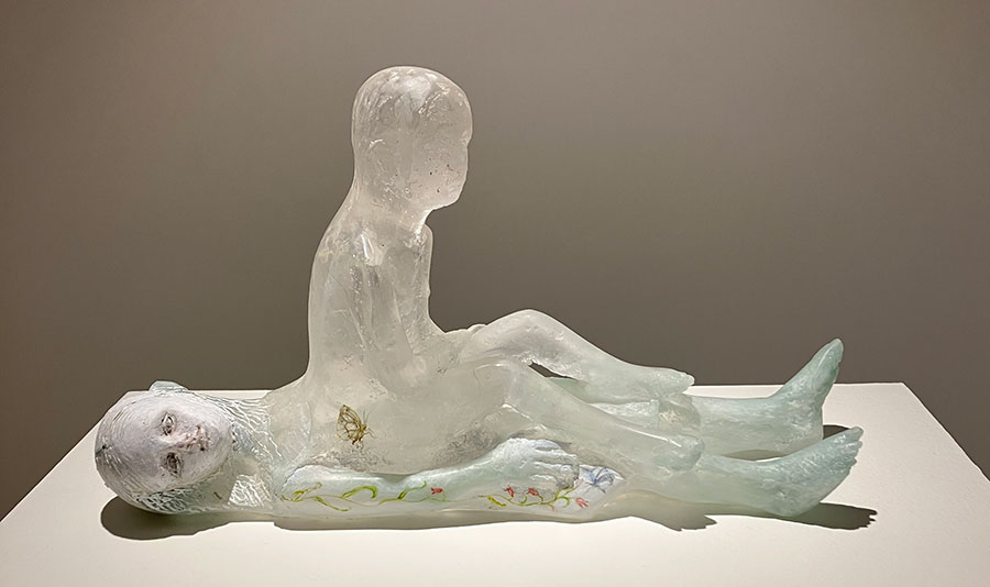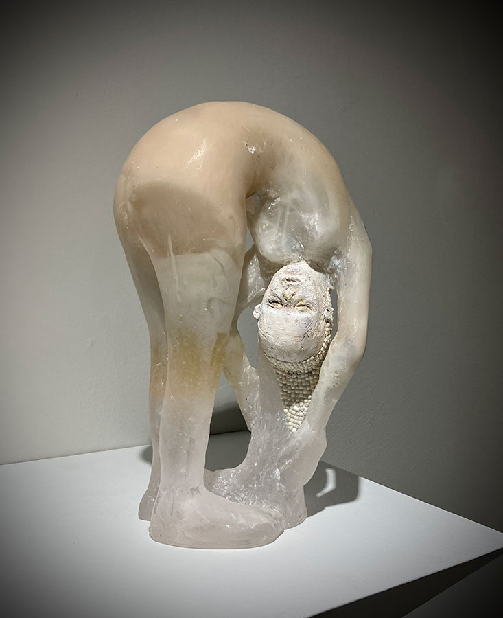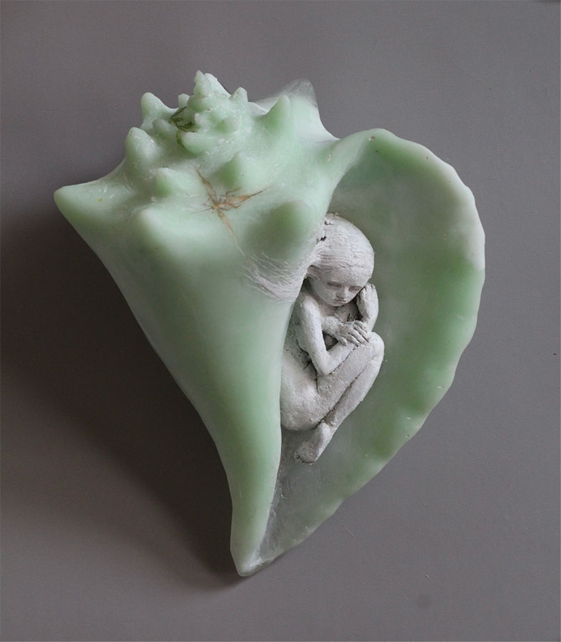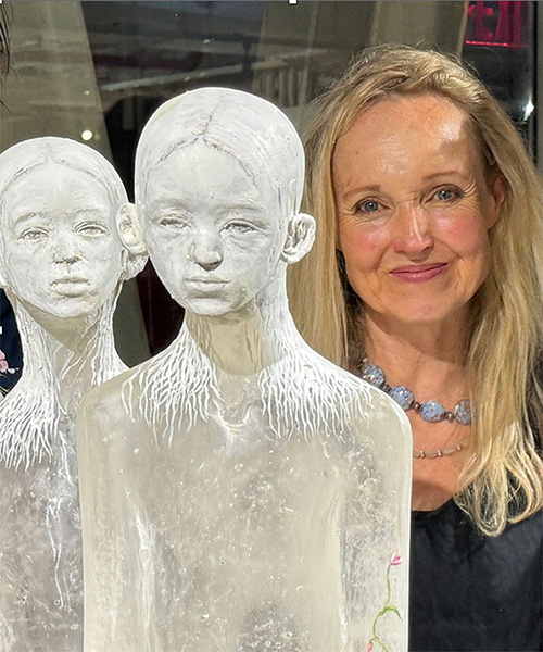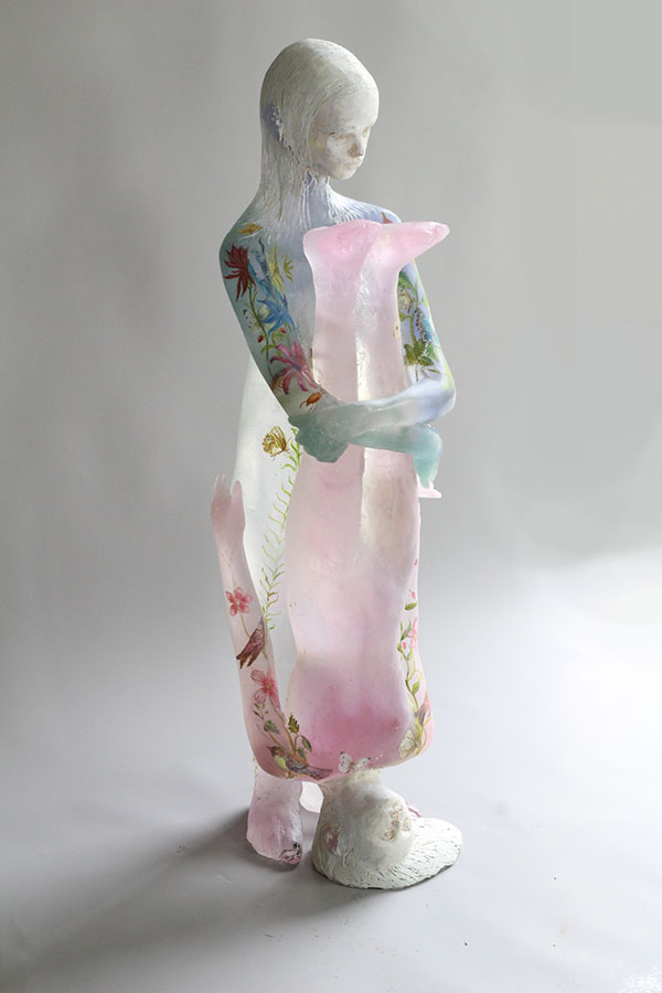 Sometimes taking human form, with bodies cast from glass and heads frequently sculpted from clay, Christina’s sculptures often have poses and facial expressions that result in an enigmatic doll-like appearance. They sometimes carry the lyrical imagery of birds, butterflies and flowers painted on their outer surfaces. Her subjects, however, are not restricted to human form; they can also be otherworldly creatures composed of a pastiche of sculpted glass and clay elements combined with fragments of dolls, found objects and carved wooden elements. Some host images of babies or human faces within their glass bodies, suggesting the sculpture’s inner spirit.