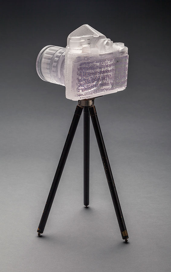 By taking photographs and fusing them permanently within glass, I link two diverse yet parallel vocabularies into a unique, sculptural vernacular. The natural play of light and optics inherently found in glass imitates the actual process of taking pictures and exposing negatives. Allowing the work itself to capture these forces, the invisible and counter-intuitive nature of light is revealed. Using the camera as a point of departure, I emphasize the aesthetics of its design, functionality, and iconic meaning, effectively demonstrating how images can both shape and distort our culture, memories, and global consciousness.